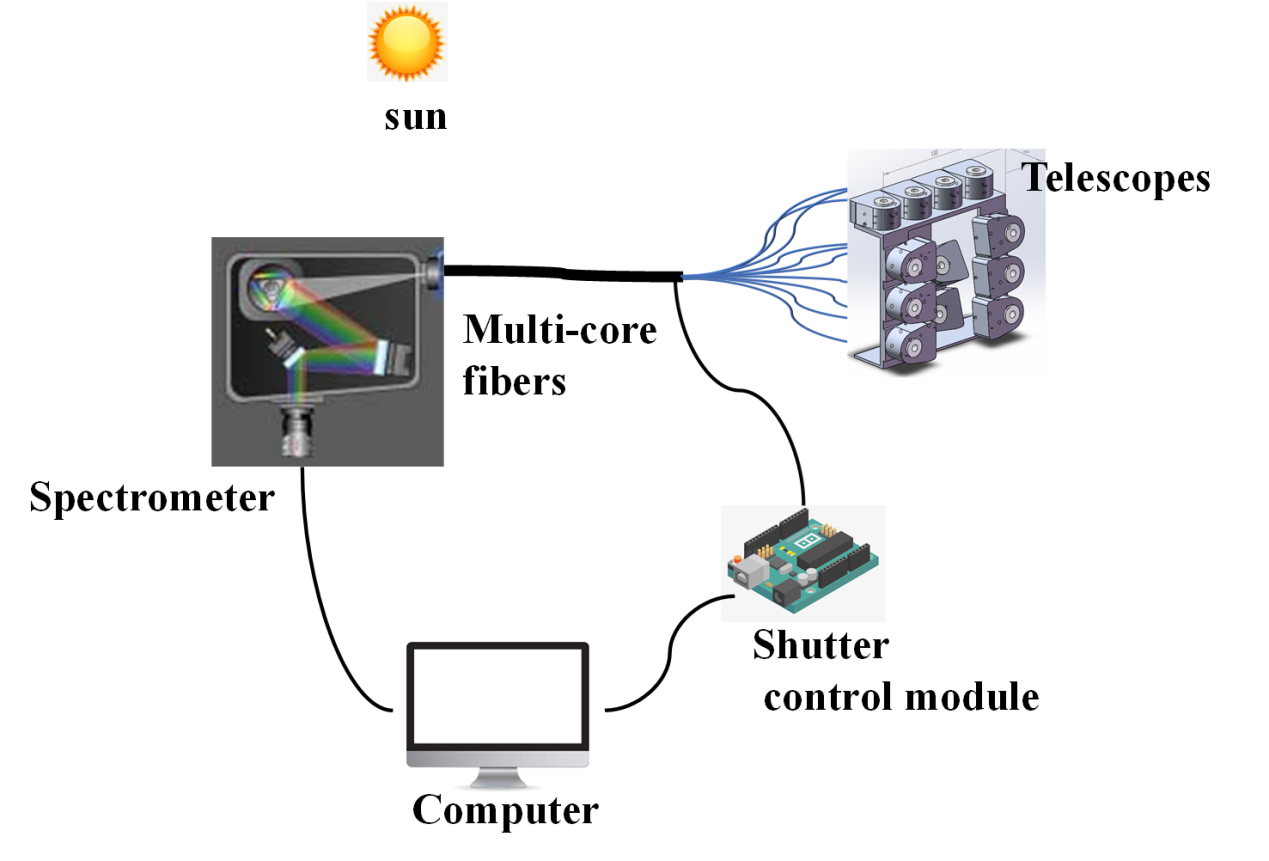 团队基于离轴多路光谱遥测的思想,采用科研级CCD成像光谱仪,自主设计的小视场角望远镜、Y型同轴分束光纤、多路机械快门控制模块实现了分钟级同步多轴的光谱采集,突破了以往多轴差分吸收光谱(MAX-DOAS)系统的采集时间分辨率限制。研究成果有望成为车载移动平台大气监测的核心设备,为大气污染监测和污染源溯源研究提供有力支持。