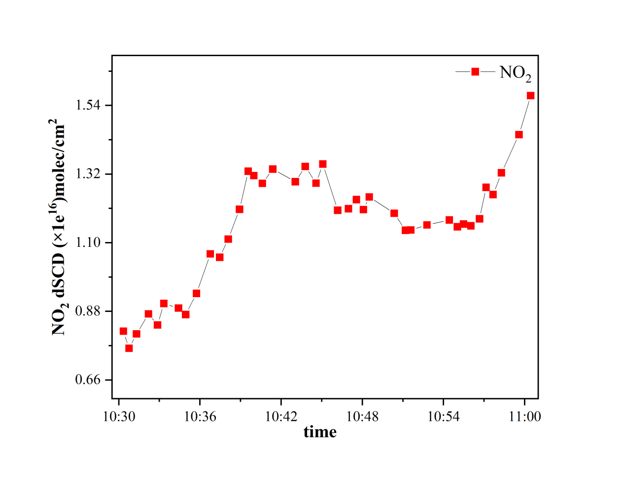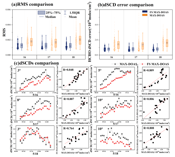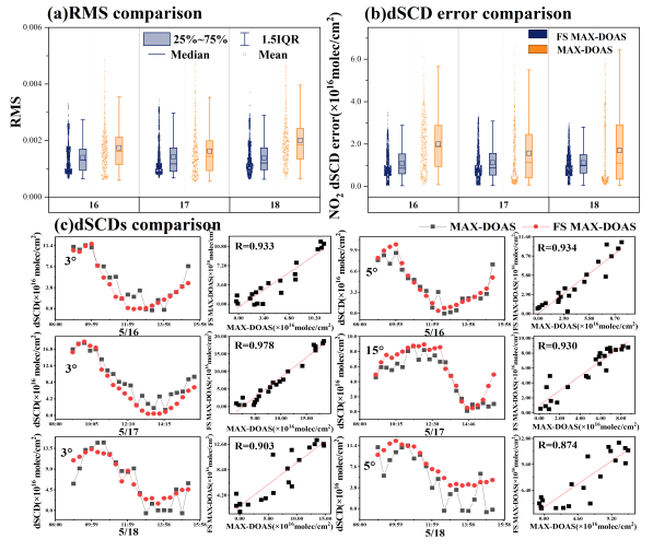 研究团队采用多仰角同步采集的方式取代了单镜头顺序采集,构建了一套地基、车载均适用的同步多轴遥测系统,实现了一个循环仰角光谱的分钟级探测,如图2所示,传统MAX-DOAS的系统分辨率一般为七分钟,新系统极大提升了采集时间分辨率。在外场试验中,同步多轴系统与MAX-DOAS、LP-DOAS系统同期观测的结果如下:在DOAS方法反演痕量气体斜柱浓度中,RMS、dSCD误差是衡量浓度准确性的重要指标,同步多轴系统反演NO2、HCHO的RMS、dSCD误差均低于MAX-DOAS,两系统反演NO2、HCHO浓度的相关性分别为0.978和0.850,由于提高了时间分辨率,同步多轴系统反演的气体廓线结果比MAX-DOAS的更细致;NO2近地面浓度对比实验中,同步多轴系统与LP-DOAS系统测得的数据相关性高达0.901。后续同步多轴系统将继续拓宽其在高时间分辨污染气体立体分布遥感领域的应用,发挥其多仰角多组分同步监测的优势。