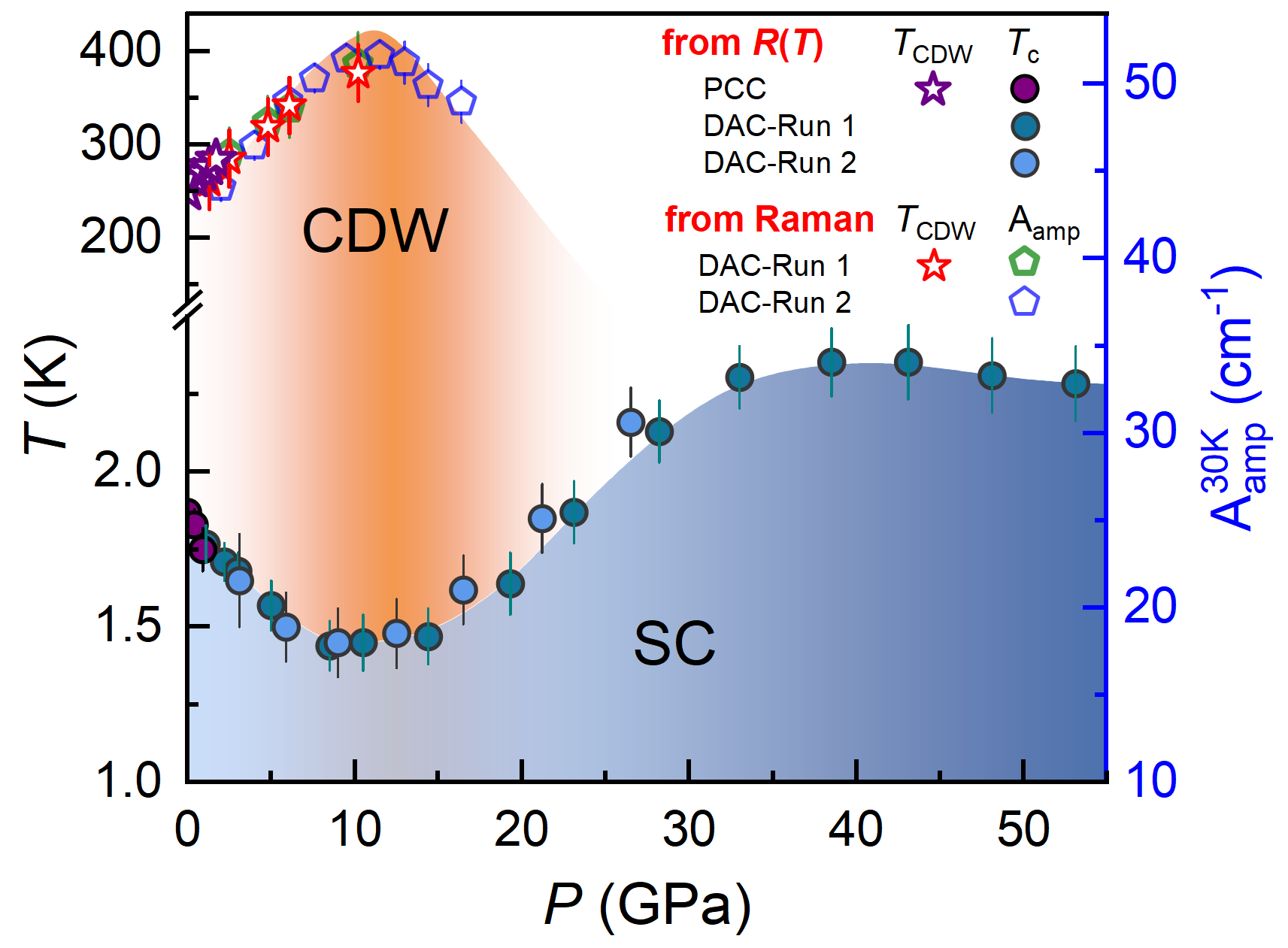 CDW和超导电性是固体中两种重要的集体激发现象,二者之间复杂的竞争和共存机制一直是凝聚态物理学领域的研究热点。许多低维结构CDW材料在常压下或在元素掺杂、插层、外加压力等调控手段的作用下也能够表现出超导电性。通常,由于压力下晶格刚度、轨道重叠或维度的增加,CDW序会被单调地削弱,最后完全消失;同时,超导电性会逐渐增强,并在邻近CDW消失时呈现穹顶型压力-超导相图。近期研究也报道了一些压力下CDW与超导电性之间异常演化的反常现象,少数材料(如过渡金属硫属化合物VSe2、ZrTe3和HfTe3)中的CDW序在压力下会反常增强,而不是被抑制。然而,这些材料在常压下均不具备体超导特性,其超导电性如何响应CDW的反常增强,目前尚不清楚。