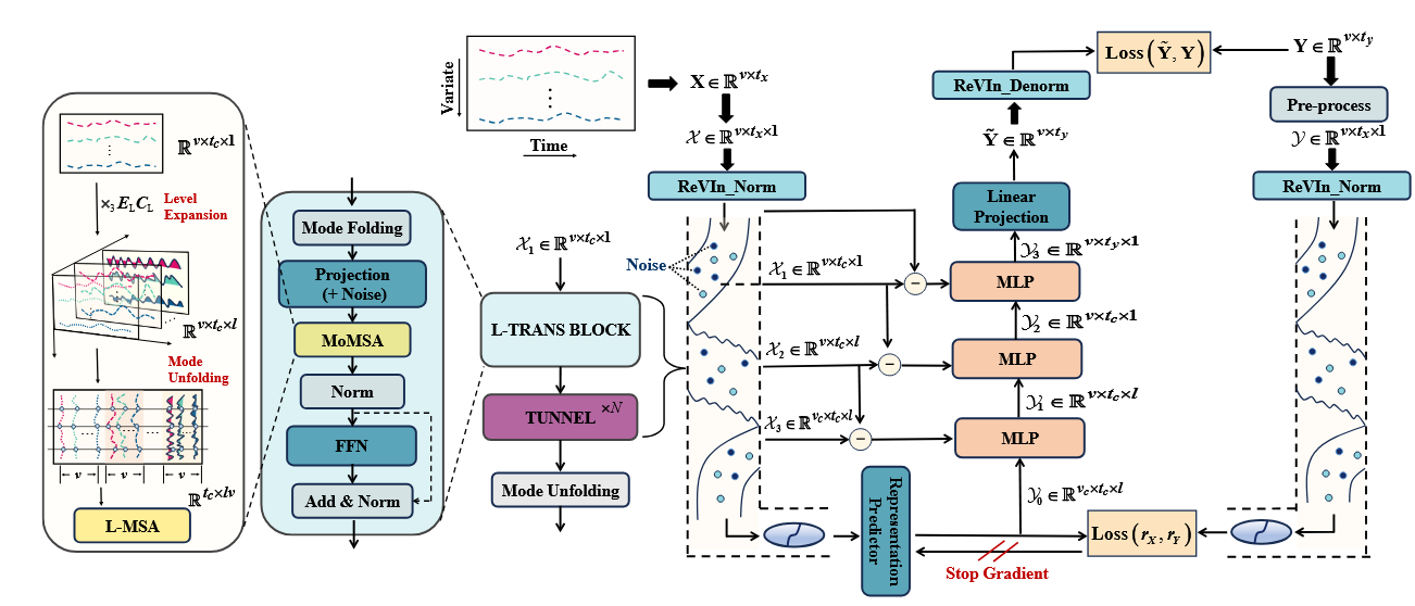 TimeCapsule是一种基于高维信息压缩原则构建的模型,它在一个通用且简化的框架内统一了这些技术。具体来说,它将时间序列建模为一个包含时间、变量和“水平层级”维度的高维信息载体,结合有损压缩理论框架,利用张量模式乘积来捕获多维度复杂依赖关系,同时实现维度压缩的高效处理。另外,本工作还在压缩表示域内提出了一种内部预测机制,并采用联合嵌入预测架构对预测表示的学习过程进行监控。