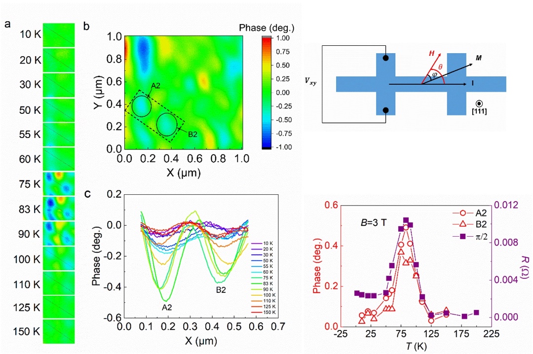 图:旋转磁力显微镜在MnGe薄膜中观测到两套磁性纹理,其随磁场和温度变化规律与PHE中出现的π和π/2周期性强度相对应,显示了二者具备关联性