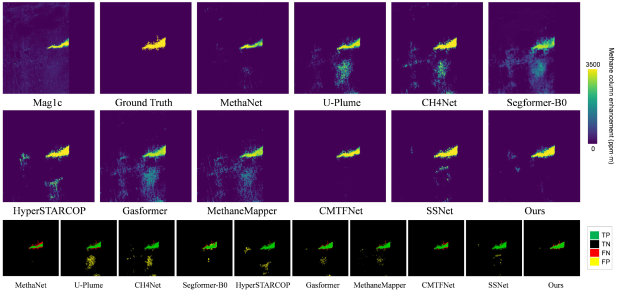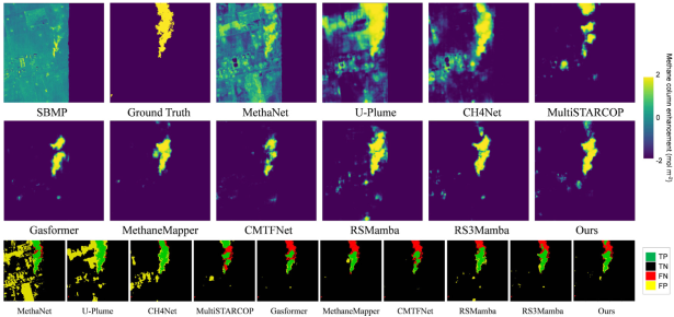 点源烟羽精确分割是排放量估算的核心环节。针对点源排放羽流遥感分割中存在的全局上下文建模不足、频谱相似干扰物导致误检率高等问题,研究团队分别提出了两种创新性的解决方案:聚焦于全局特征感知,基于FSDINet融合频域与空间域的甲烷羽流分割网络方法将多尺度光谱特征注入频率域与空间域,实现了全局信息捕捉与局部细节重建的协同建模;侧重误差控制与小目标聚类,使用kMetha-Mamba K均值曼巴甲烷分割模型方法引入基于谱导数特征的改进型k-means聚类机制,结合Mamba状态空间模型提升弱信号的识别精度与抗干扰能力。