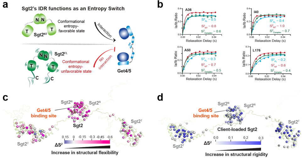 图2. Sgt2的IDR通过调控分子构象熵,实现了无需直接接触的远程自抑制和激活机制,从而动态切换蛋白的结合能力