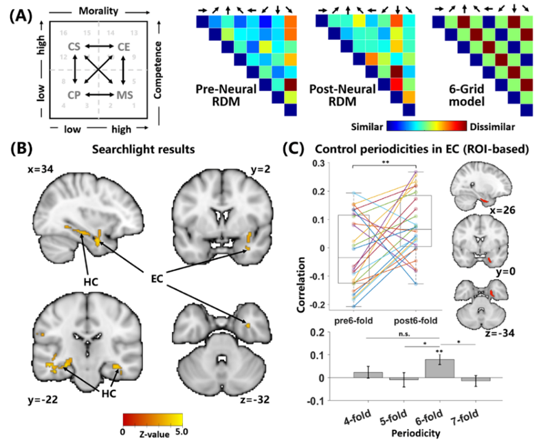 研究结果提供了行为与神经层面的双重证据:行为层面,当两个人之间的社会等级差距越大,受试者做出判断的速度越快、准确率也越高。这表明,人们在进行社会判断时,依赖的是一张内在的“地图”,而非逐一回忆孤立的信息。神经层面,成像结果精准定位了这张“地图”的绘制者——大脑中负责空间记忆与导航的海马体-内嗅皮层系统。分析显示,海马体的核心功能是编码个体间的相对“社交距离”;而内嗅皮层则更进一步,以一种独特的六边形网格模式进行编码,为这张抽象地图提供了方向和结构,类似于物理地图上的坐标网格。