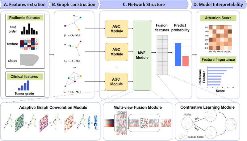 术后放疗在胶质瘤治疗中具有重要作用,但仅部分患者对治疗有明显反应。因此,放疗前准确预测治疗反应对于制定个体化的剂量调整策略至关重要。传统预测方法依赖临床因素,难以反映肿瘤异质性带来的影响。影像组学通过提取肿瘤区域的细微特征,在预测方面表现优于传统模型。然而,目前模型仅关注单一感兴趣区域,未能充分考虑术后放疗靶区中肿瘤微环境的空间异质性与其对治疗结果的潜在影响。此外,现有的“生境分析”方法虽能将异质性肿瘤分割为具有不同生物特征的子区域,但在实际应用中仍存在利用不足、特征融合导致过拟合,以及传统机器学习模型难以捕捉复杂区域间关系等问题。