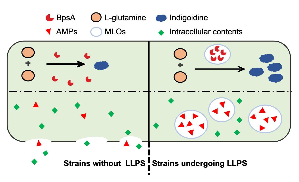 液液相分离驱动的无膜细胞器是一种新兴的细胞结构工程技术,通过动态隔离酶和底物,有效提升代谢效率并增强目标产物的合成。该研究在谷氨酸棒杆菌中成功构建了功能性无膜细胞器,以新型生物蓝色染料(indigoidine)为模型,将产量提升了2.43倍,验证了这类合成凝聚体在代谢途径优化中的应用潜力。此外,团队通过对抗菌肽melittin和lactoferricin B进行空间隔离,有效降低了其对宿主细胞的毒性,实现了毒性生物物质的成功表达。本研究为解决工业微生物中“低产率”和“高毒性”两大关键瓶颈提供了新的思路,也进一步拓展了LLPS技术在工业生物制造领域的应用边界。