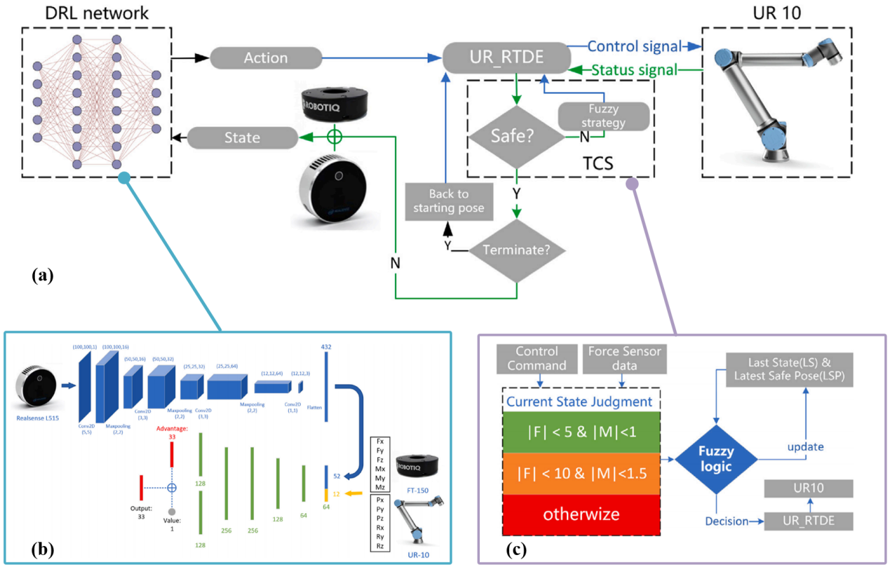 传统轴孔装配方法仅依赖光学或力/力矩传感器,存在精度有限或对准效率低的问题。殷若尘等人提出一种基于深度强化学习的多传感器融合方法,结合二维相机与力/力矩传感器数据,模拟人类手眼协调机制,以应对辐射环境和光滑金属表面等挑战性条件。通过多输入分支神经网络融合异构传感信息,并在装配过程中动态调整数据权重,实现了快速且高精度的装配。实验表明,该方法在轴孔间隙小于0.1毫米的刚性装配任务中表现优异,兼具高成功率和安全性。本研究证明仅凭二维摄像头即可完成高精度轴孔装配,对辐射环境等特殊场景下的自动化操作具有推进作用。