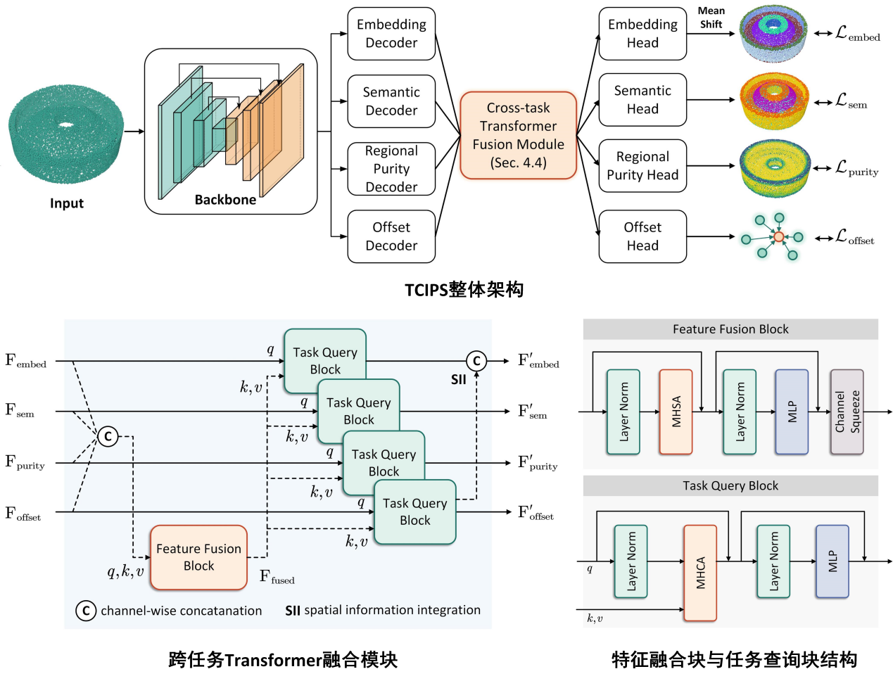 在聚变遥操作维护中,环境感知需获取实例与语义信息以识别定位孔洞、管道、焊缝等目标。基元分割作为核心任务,旨在从点云中分割出平面、球体、圆柱等几何基元。传统RANSAC方法调参耗时且对复杂曲面处理能力有限;现有深度学习法则多忽略任务交互与全局空间关系。为此,汪涛等人提出基于Transformer的跨任务交互基元分割模型TCIPS,利用其长程依赖建模优势增强任务间特征交互与空间关系感知。此外,引入无额外标注的辅助任——中心偏移预测与区域纯度预测,通过加强空间拓扑与边界感知进一步提升分割精度。实验表明,TCIPS在公开与真实点云数据中均表现优异,泛化能力强,在边缘及复杂邻接区域改善显著。该研究提升了聚变维护环境的感知可靠性,也为三维基元分割提供了新思路。