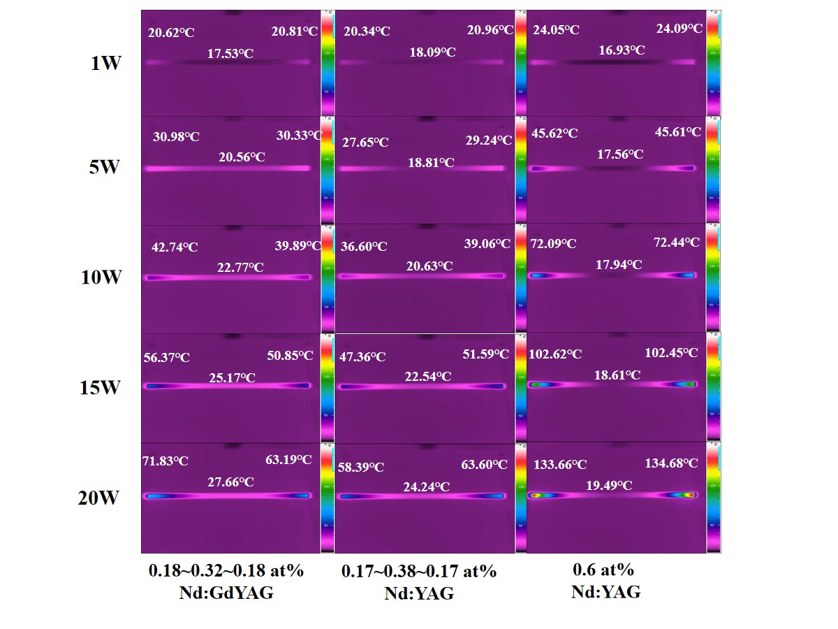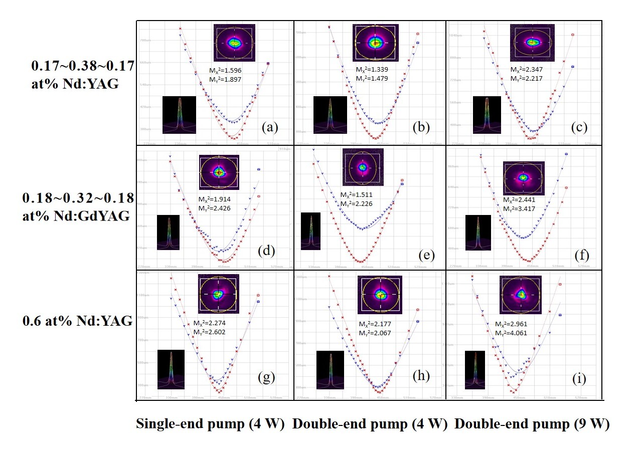 采用808nm半导体激光器进行双端面泵浦,20 W泵浦功率下,0.17-0.38-0.17 at% Nd:YAG晶体棒的两端与中间的温度差仅为37℃,与均匀浓度0.6 at% Nd:YAG棒的温度差相比,降低了三分之二。0.17-0.38-0.17 at% Nd:YAG晶体棒的最大输出功率为14.47 W,斜效率为51.7%,分别比0.6 at% Nd:YAG 提高了45.1%和62.1%。在9 W输出功率下,0.17-0.38-0.17 at% Nd:YAG晶体棒的光束质量因子为Mx² = 2.347 和My² = 2.217,显著优于0.6 at% Nd:YAG的Mx² = 2.961 和My² = 4.061。0.18-0.32-0.18 at% Nd:GdYAG的性能均优于0.6 at% Nd:YAG,但受限于自身热导率的限制,激光性能略差于0.17-0.38-0.17 at% Nd:YAG。