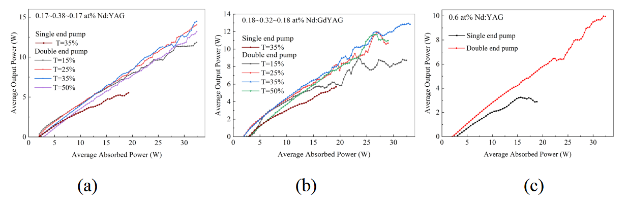图3 激光性能:(a)0.17~0.38~0.17 at% Nd:YAG; (b)0.18~0.32~0.18 at% Nd:GdYAG; (c)0.6 at% Nd:YAG