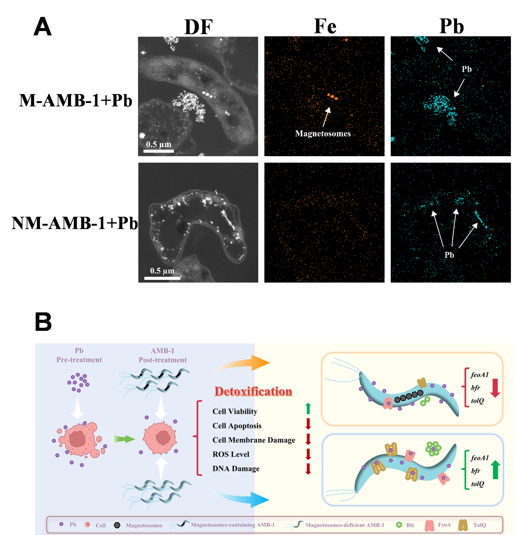 铅(Pb)作为一种生物半衰期长、环境持久性高及毒性强的重金属污染物,已对全球公共卫生安全构成严重威胁。当前临床治疗Pb中毒主要使用金属离子螯合剂,但由于其缺乏特异性及潜在的毒副作用,亟待开发高效且安全的Pb解毒新策略。趋磁细菌凭借高效的重金属富集能力和优良的生物相容性,已广泛应用于环境重金属修复和生物医学领域。然而,对于重金属在生物体内诱导的毒性效应,趋磁细菌能否发挥独特应用优势,目前仍未可知。