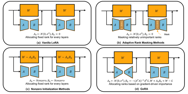 GoRA是一种全新的低秩自适应微调框架,旨在同时解决低秩微调方法LoRA中的两个关键瓶颈问题:秩的选择与权重初始化。现有方法通常仅优化其一,或在提升性能的同时牺牲效率与实用性,而GoRA创新性地利用预训练权重的梯度信息,在训练前动态分配每个适配器的最优秩,并以梯度压缩为基础对低秩矩阵进行自适应初始化。这一设计不仅避免了对原始预训练权重的修改,彻底消除了训练与推理之间的“权重不一致”问题,还显著提升了微调性能,同时几乎不增加额外的计算或内存开销。值得一提的是,GoRA保持了与标准LoRA完全兼容的结构设计,可无缝集成到现有大模型训练流程中,并支持分布式训练。其引入的自适应梯度累积与缩放因子自动调优策略,进一步降低了超参数调优负担,显著提升了方法的“开箱即用”能力。