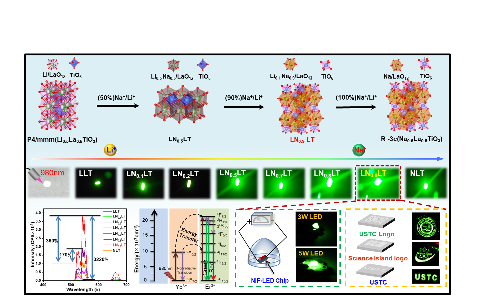 近期,中国科学院合肥物质院固体所能源材料与器件研究部蒋长龙研究员团队在高效、热稳定的上转换发光材料研发方面取得重要进展。团队创新性地在钛酸盐钙钛矿基质中提出了一种双阳离子取代策略,成功制备出上转换发光(UCL)强度和量子...