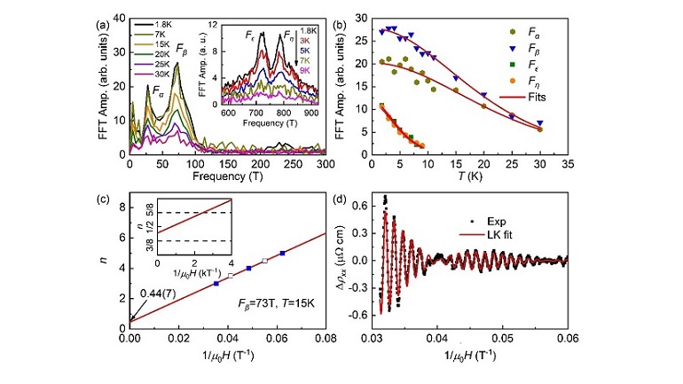近日,中国人民大学物理学系雷和畅教授、刘凯教授,与中科院合肥研究院强磁场中心开展合作,利用稳态强磁场实验装置研究了强磁场下CsV3Sb5单晶的量子输运物性。通过对Shubnikov-de Haas(SdH)量子振荡的分析以及与理论计算结果比较,...