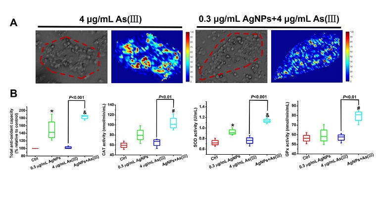 近日,中国科学院合肥物质科学研究院强磁场科学中心许安课题组在纳米银拮抗砷诱导的遗传毒性研究中取得新进展。课题组在研究中发现,无毒浓度的纳米银可通过降低重金属砷在哺乳动物细胞中的生物累积和提升细胞内抗氧化能力来拮抗砷诱...