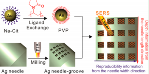近日,医学物理与技术中心生物电子技术研究室杨良保研究员等利用聚焦离子束在针灸银针上构筑了微米槽阵列,实现了高稳定性SERS活体内检测。相关成果以Gold Nanoparticle-Decorated Silver Needle for Surface-Enhanced Raman Spectros...