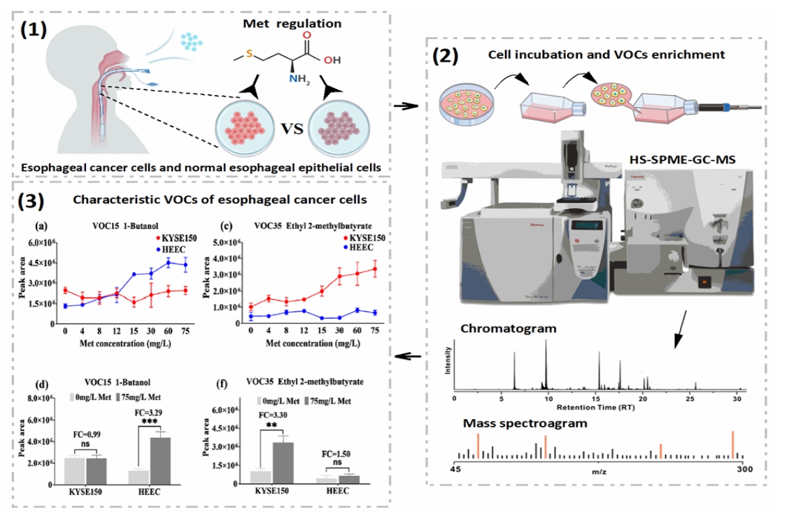 健康所发展食管癌细胞识别新方法取得进展近日,中国科学院合肥物质院健康所医用光谱质谱研究团队采取甲硫氨酸调控策略,借助气相色谱质谱(GC-MS)非靶向分析,发现用两种挥发性有机物(VOCs)可以识别食管癌细胞,该研究发表在美国AC...