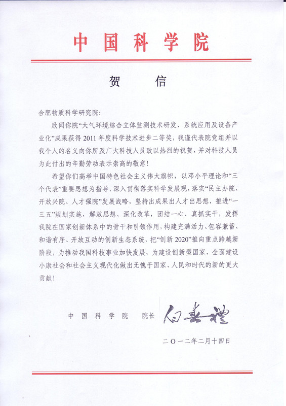 2月15日,科学院院长白春礼特发来贺信祝贺合肥研究院主持完成的“基于力传感的人体运动信息在线获取方法与现场训练指导系统”、“大气环境综合立体监测技术研发、系统应用及设备产业化”两项成果分别获2011年度国家技术发明二等奖和科...