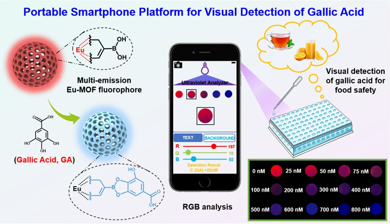 近期,中科院合肥研究院固体所能源材料与器件制造研究部蒋长龙研究员团队在没食子酸(GA)的可视化分析检测方面取得新进展。该团队采用铕离子(Eu3+)与3,5-二羧基苯硼酸(BBDC)配位聚合构建多发射铕金属-有机骨架荧光团,通过便携式传感平...