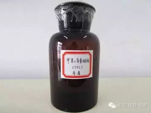 甲苯二异氰酸酯为无色有强烈刺鼻味的液体,遇光变黑,对皮肤、眼睛有强烈刺激作用,并可引起湿疹与支气管哮喘。