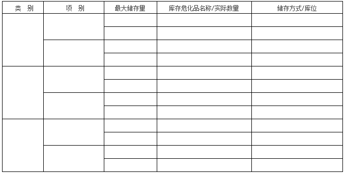8.1.2 根据确定的类别和项别,建立危化品安全特性和储存台账,并及时更新;台账格式如下: