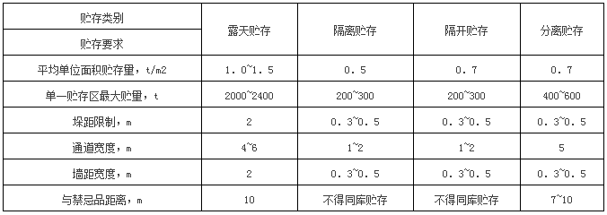 8.3.2 根据确定的禁忌存储要求,确定各类危化品的储存方式,包括隔离储存、隔开储存、分离储存三种方式,并符合下表的间距、储存量等要求: