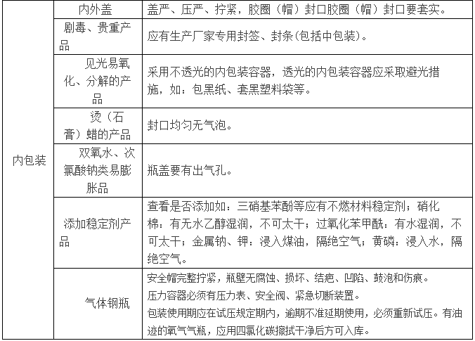 l 瓶装危化品,检查其瓶子是否泄漏;袋装危化品检查其是否破损;散装的危化品,检查其容器是否完好,同时检查数量是否符合要求。