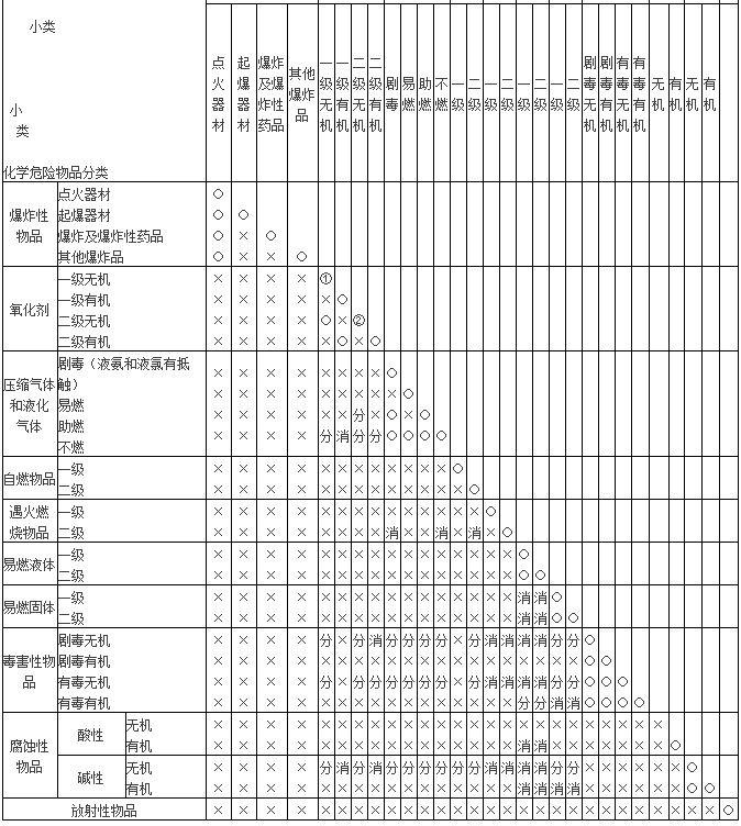 “分”指应按化学危险晶的分类进行分区分类贮存。如果物品不多或仓位不够时,因其性能并不互相抵触,也可以混存;