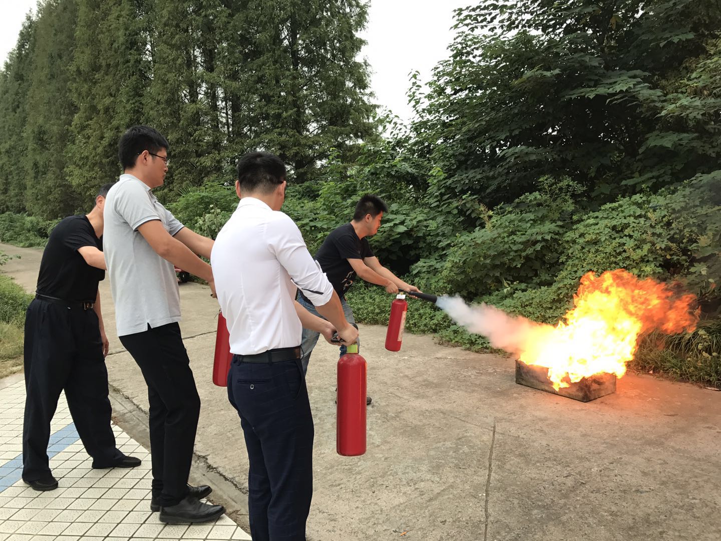 安全消防知识培训后,所安保办邀请科学岛消防队进行了消防实地灭火演练。培训学员们纷