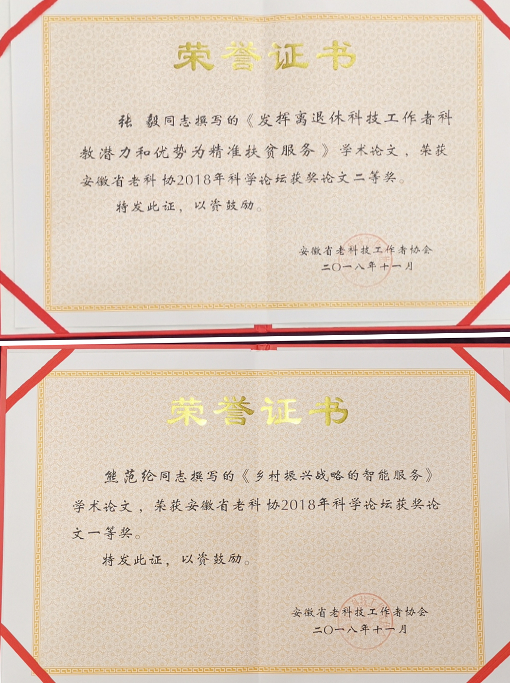 11月21日,安徽省老科协2018年科学论坛在桐城市举办,本届论坛的主题是“实施乡村振兴战略,加快推进农业农村现代化”,全省各地老科协共推荐了115篇论文参加评选,合肥研究院老科协熊范纶老师的《乡村振兴战略的智能服务》获得一等奖,张毅老师的《发挥离退休科技工作者科教潜力和优势为精准扶贫服务》获得二等奖。