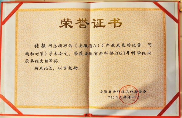 会议对获得安徽省老科协2023年科学论坛优秀论文奖的作者和优秀组织单位颁发了荣誉证书和奖牌。7篇获得特等奖的作者在会议上就元宇宙、人工智能生成内容(AIGC)、旱地稻、光伏、老工业城市绿色转型、设施水产养殖和大豆的产业创新发展等研究成果进行了交流发言。合肥物质院老科协继2022年获得特等奖2篇,二等奖1篇,三等奖1篇后,2023年,老科协张毅研究员、刘锦怀研究员撰写的《安徽省AIGC产业发展的优势、问题和对策》、《关于新形势下加快我省农村生活污水治理的建议》分别获得了特等奖和一等奖。据统计,2022年7月至2023年10月,安徽省老科协共撰写决策咨询报告13篇,其中合肥物质院老科协提交4篇。这其中:刊登在安徽省科协《安徽省科技工作者建议》上11篇,合肥物质院老科协署名的有4篇;获得省级领导批示5篇,其中合肥物质院老科协报送的有2篇;在正式刊物上发表论文发表4篇,合肥物质院老科协撰文2篇。
