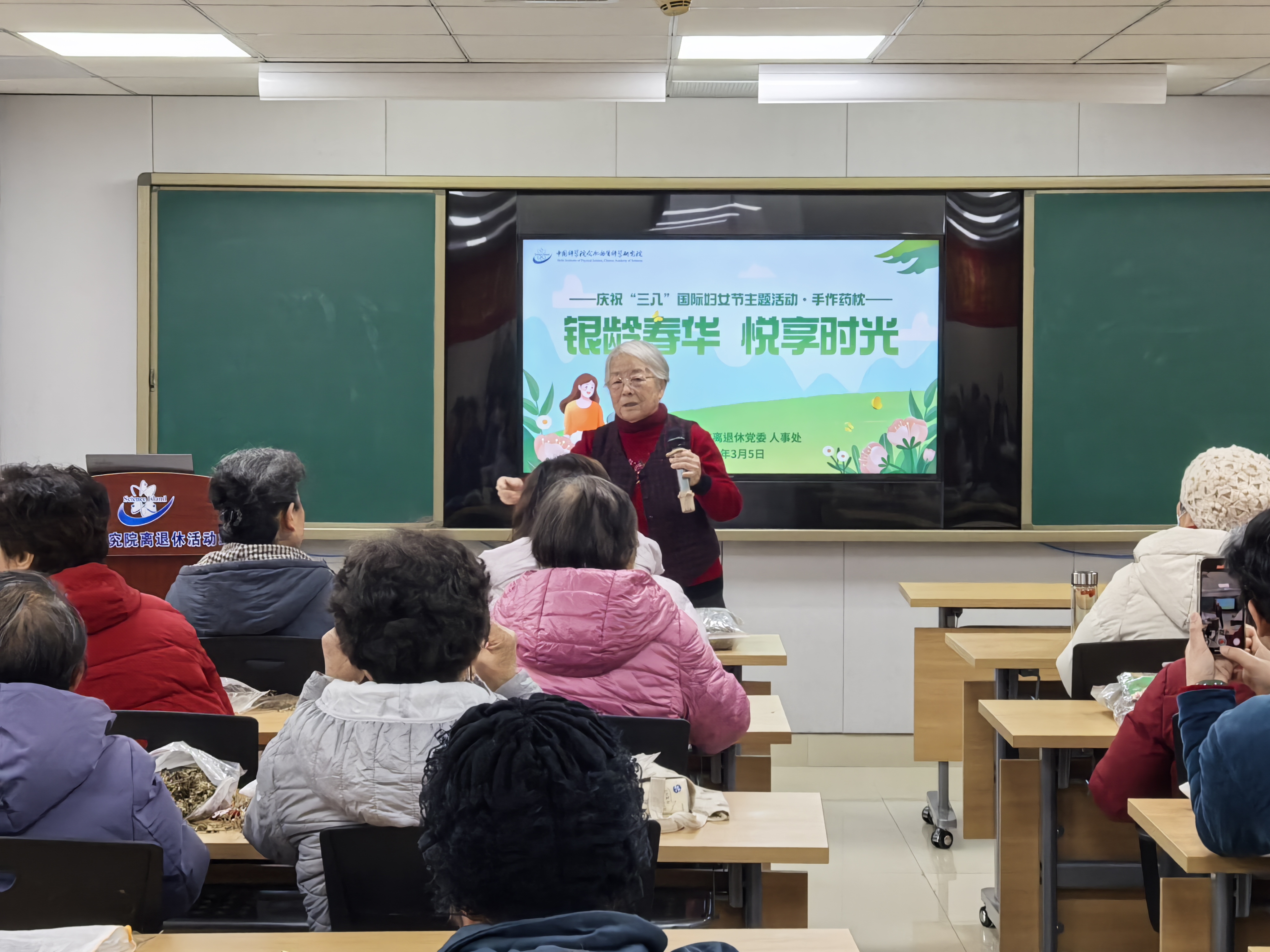 3月5日下午,50多位退休女职工相聚在科学家园活动站3栋综合活动室,开启了一场别开生面的药枕制作体验。活动由离退休党委副书记吴婧主持。活动开场,90岁高龄的靳福嫏老师即兴献唱《三八妇女节歌》,欢快的旋律、激昂的歌词,抒发了老同志们退休生活的幸福感和对美好生活的期许。随后,工作人员详细讲解药枕的功效与制作方法,老同志们认真聆听。在制作过程中,大家相互交流、相互帮助,一双双巧手灵活地填装药材,制成了一只只药香味枕芯,脸上洋溢着幸福与喜悦,现场氛围热烈而温馨。
