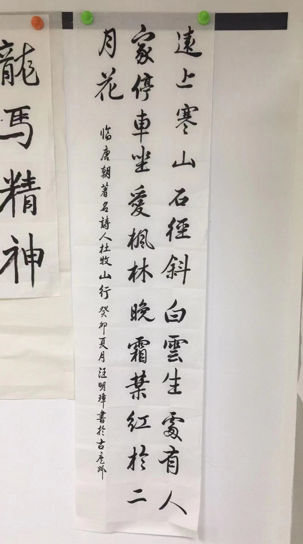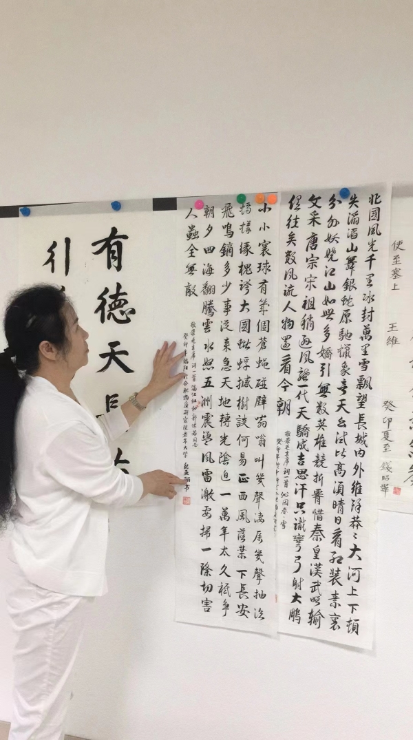 学期结束时,学员们在现场展示了自己创作的条幅作品。特别是几位新学员,经过勤学苦练,进步十分明显。大家表示在学习中领略了中国书法的博大精深,体会到了书法的无比魅力。书法教育加深了学员们对汉字美的认识,让夕阳红人生更有意义更有情怀。