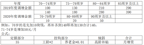 答:我省今年高龄倾斜办法有两个变化:一是统一企业和机关事业单位退休人员高龄倾斜标准。二是70周岁及以上退休人员高龄倾斜部分均有增加。具体调整办法是:截至2020年12月31日,年满70-79周岁的退休人员每人每月增加10元,年满80-89周岁的退休人员每人每月增加20元,年满90周岁及以上的退休人员每人每月增加50元。其中,对2020年到达70周岁、75周岁、80周岁、85周岁的退休人员,按照上述办法倾斜调整后,累计享受高龄倾斜部分低于140元、180元、280元、390元的补齐至上述标准。