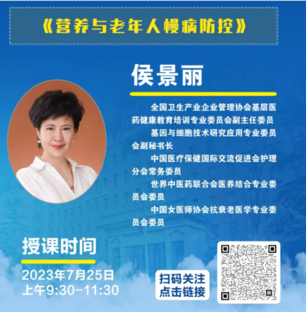 关于组织收看《营养与老年人慢病防控》专题讲座的通知 发布时间:2023-07-24 作者: 【打印】 【小 中 大】 【关闭】 【关闭】 尊敬的离退休职工: 7月25日上午9:30-11:30将组织收看《营养与老年人慢性防控》线上专题讲座。本场讲座由全国卫生产业企业管理协会基层医药健康教育培训专业委员会副主任委员侯景丽主讲,时长约120分钟。感兴趣的离退休职工可自行扫码观看。