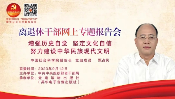 本场报告会由中国社会科学院副院长、党组成员甄占民作“增强历史自觉、坚定文化自信,努力建设中华民族现代文明”专题报告,时长约83分钟。