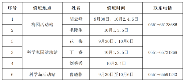 1.2023年中秋国庆节各离退休活动站集中放假时间为9月29日(周五)至10月6日(周五),共8天,10月7日(周六)起正式上班。9月29日(周五)离退休各活动站不安排值班人员,具体值班表如下: