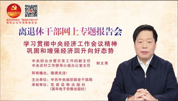 去年12月召开的中央经济工作会议是在全面建设社会主义现代化国家开局起步的关键时期召开的一次重要会议。习近平总书记的重要讲话,全面总结2023年经济工作,深刻分析当前经济形势,精辟概括新时代做好经济工作的规律性认识,系统部署2024年经济工作。为帮助广大离退休干部深入学习领会中央经济工作会议精神,唱响中国经济光明论,凝聚全面推进强国建设、民族复兴伟业的强大力量,中央组织部老干部局拟通过“离退休干部工作”微信公众号,采取录播方式,举办第21场全国离退休干部网上专题报告会。