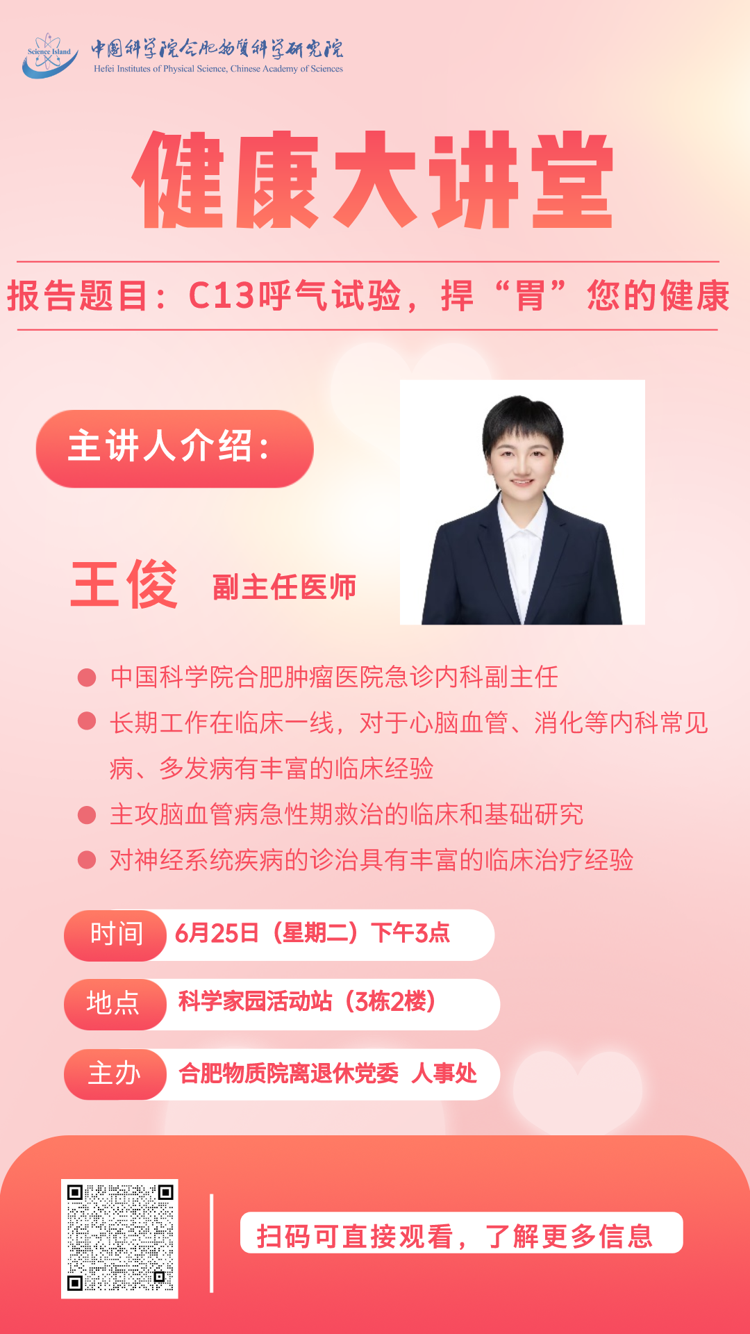 为切实将关心关爱离退休职工举措落到实处,增强离退休职工健康意识,结合当前离退休职工需求,合肥物质院离退休党委、人事处定于6月25日(星期二)下午3点在科学家园活动站(3栋二楼)多媒体教室举办C13呼气试验,捍“胃”您的健康线下讲座,讲座将线上同步进行直播,届时欢迎大家收看。