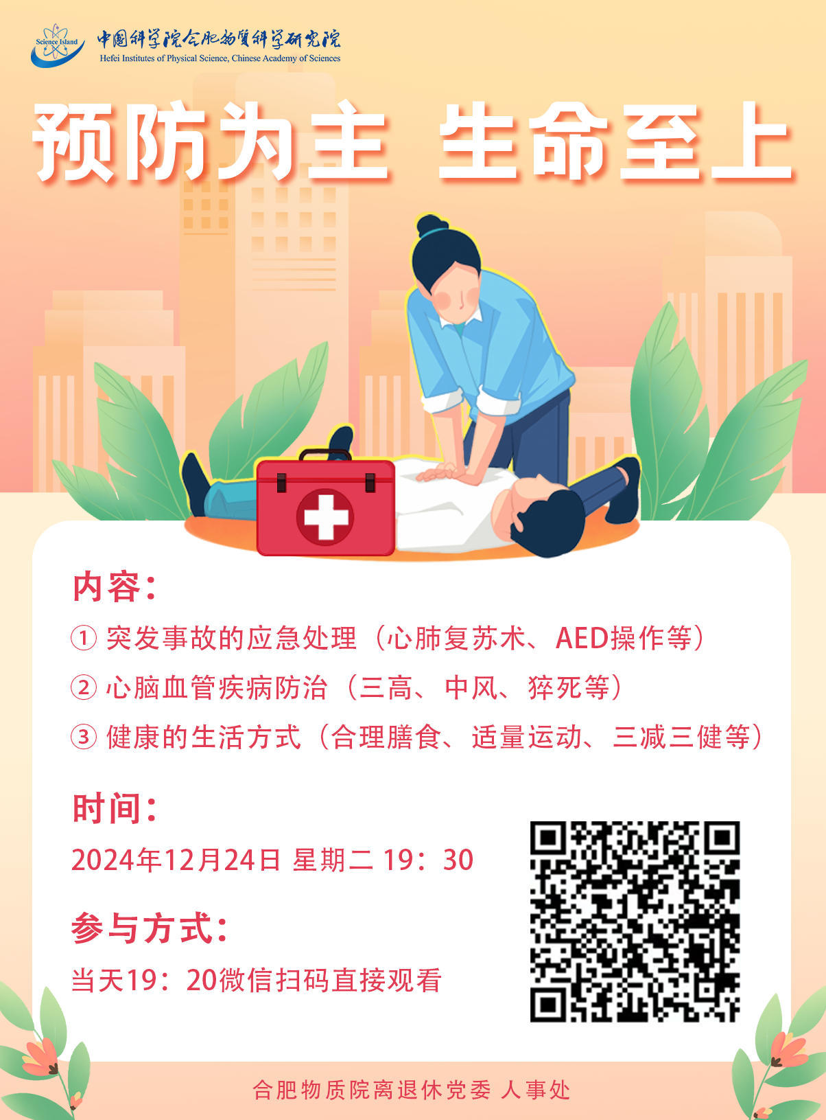 关于观看“预防为主 生命至上”线上公益讲座的通知 发布时间:2024-12-20 作者: 【打印】 【小 中 大】 【关闭】 【关闭】 为普及应急救护知识,切实增强自救互救能力和应对突发事件的处理能力 ,形成人人会急救、懂急救、做自己健康第一责任人的良好氛围,12月24号(下周二)19:30将开展“预防为主 生命至上”线上公益课程,具体内容可见下方海报:一、讲座时间:12月24日(下周二)19:30-21:00二、讲座方式:线上直播(长按识别海报二维码进入观看)