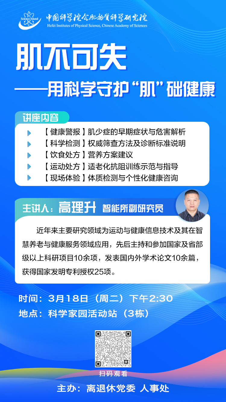 为进一步提升广大离退休职工增强自我保健意识与能力,合肥物质院离退休党委联合智能所运动与健康信息技术研究中心,特举办健康讲座,诚邀您积极参与,让我们用科学守护“肌”础健康,为幸福晚年保驾护航!