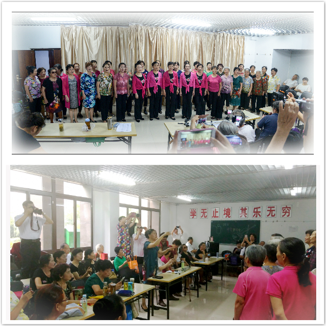 本学期家园老年大学开设两个声乐班,有的从政务新区、梦园、科学岛赶来上课和参加活动,会员持续旺盛人气。协会理事与热心会员上午9点多就来布置会场。搬出课桌,从其他教室搬进座椅,确保演员观众有足够的座位。李必翠老师加班加点制作会标,张惠葆老师将窗帘移置到演出背景墙一侧,使原先拉着铁丝挂着标语牌的杂乱白墙变成了一方金色的帷幕,演出环境大为改观。。