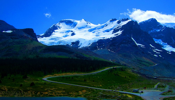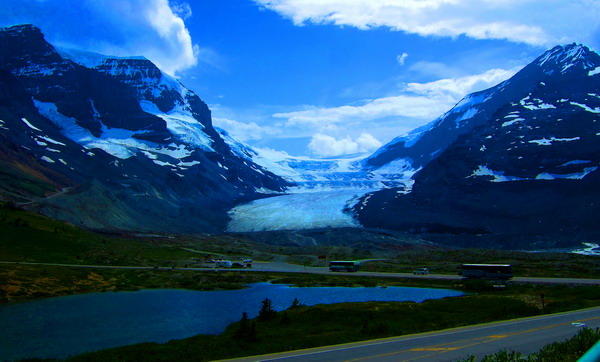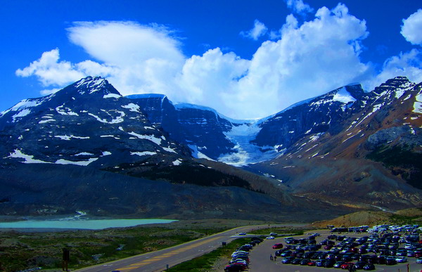 该地区冬天极为寒冷,可达零下50度C,大雪封山,交通断绝,不能旅游。夏天游客可以乘坐特殊的巨轮雪车到冰川上观光。我和爱妻是去年7月份随旅行团去的。著名的阿萨巴斯卡河、北萨斯喀彻温河以及哥伦比亚河都发源于哥伦比亚冰原。这里是北美洲水文最高点,水向北流入北冰洋,向东流入大西洋,向南向西流入太平洋。