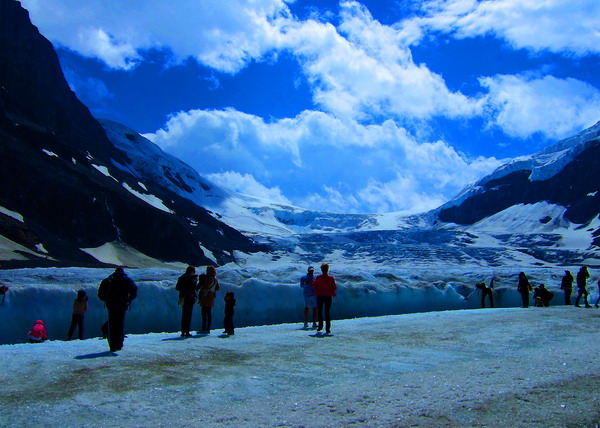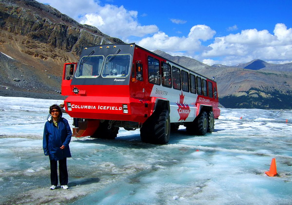 旅游非常安全,坐的巨轮雪车轮子直径有1.5米,宽约1.2米,而且每车有6个轮子,在冰雪上不打滑,可以爬60度的陡坡,全世界只有23辆。为了保持雪原地面的洁白干净,在雪车进入冰原前要经过一个不深的水池,清洗轮胎上的泥沙杂物。我们到冰原上可以下车自由拍照玩耍,尽情享受难得的大自然恩典。冰雪在阳光照耀下晶莹剔透,洁白幽蓝,高山的空气极为洁净,使人心旷神怡。我拍了点照片请大家指教!