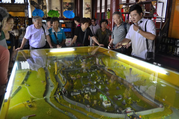 导游告诉我们,由此牌坊后登山,可游览屈原故里各个景点,从后山下,乘观光车返回,一个半小时后,10:20在大门口集合。听说要登山,有些年长或腿脚不便的畏惧了,但大部分人还是选择上去看一看。其实这里算不了什么山,走了不到一刻钟的上坡路,就来到相对集中的景点。我们先参观端午民俗村、江渎庙。江渎庙背山临江,与三峡大坝遥遥相对。庙前一小岛,突出江中,间以索桥相连。这是个观景的好去处。我们从颤巍巍的索桥过去,只见临江观景台上,屈原《离骚》的竹简雕塑,舒展自然。与远处开阔的江景,宏伟的大坝相衬托,显示出一种独特的自然和人文气息。像哥伦布发现了新大陆,大家兴奋异常,纷纷拍照、摄像,留连忘返。这时有人说,别在这里待时间太久了,前面还有龙舟村呢?于是,赶紧转向,没走多时,在绿树丛中,一只五彩龙头高高探出,令人称奇。走到近处,一条修长无比的彩色龙舟映入眼帘。大家又一阵惊喜,拿起相机选取角度拍照,几位女同胞尤其兴奋,坐在龙舟里举手喊“耶”过足了摆拍瘾。