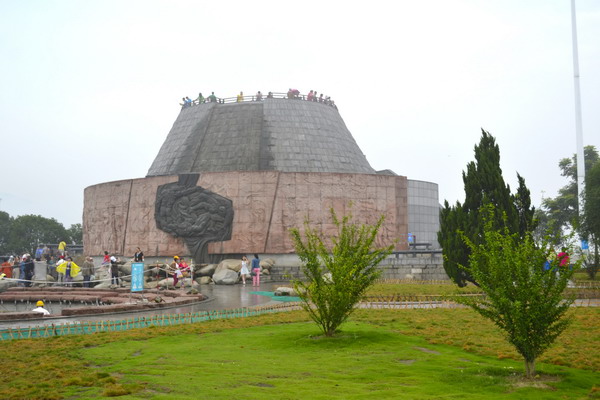 大坝看不清不要紧,还有另一个角度可以近距离接触。从坛子岭另一条道乘电梯下行两级,坝区旅游车会把我们送到下一个旅游景点——截流纪念园。沿途看到大坝合龙时用的巨大的三角形混凝土截流石,装满石块的铁网箱,超大型施工机械,这都让人想起这举世瞩目的工程,堪称世界奇迹!我们来到有江泽民题字的“长江三峡水利枢纽”的游览区,这里与大坝仅隔几十米,可以直观大坝。坝顶相当宽。近看方知,那上面一台台红色机械原来是起吊闸门的起重机。之后又到大坝侧面近距离看坝体,高峻壁立,雄伟壮观。可惜雨下得太大,冒雨照了一些像,就乘车回酒店。