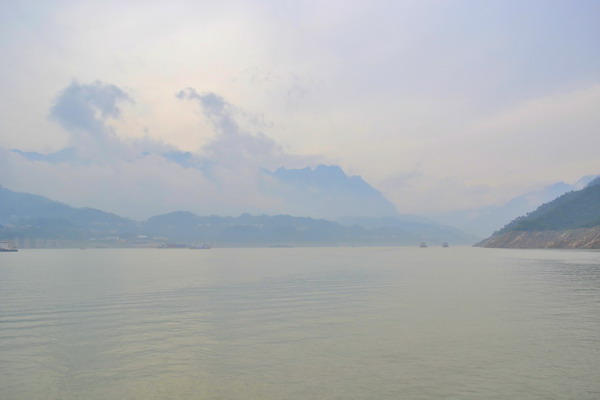 下午天放晴,我们乘车去船码头,坐高峡平湖号游轮游览三峡上游库区。行程来回将近两个小时,看到两岸群山连绵,峰陡江阔,这就是毛泽东同志遐想的“高峡出平湖”了。随着游船上行,江面渐渐变得狭窄,山峰奇绝,云缠雾绕。有时看看船好像过不去了,但转一个弯,“柳暗花明”,宽阔的水道又在眼前。6月中旬,还不是丰水季节,水际线上有相当一截草木不生的山体,像刀切过一般,十分清晰。船工告诉我,这里水最大时可淹到上面那条线。被淹过的地方,就都草木不生了。看标尺,现在是