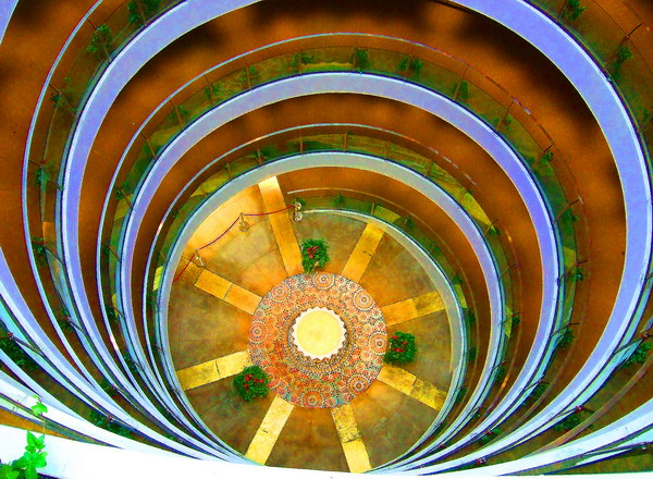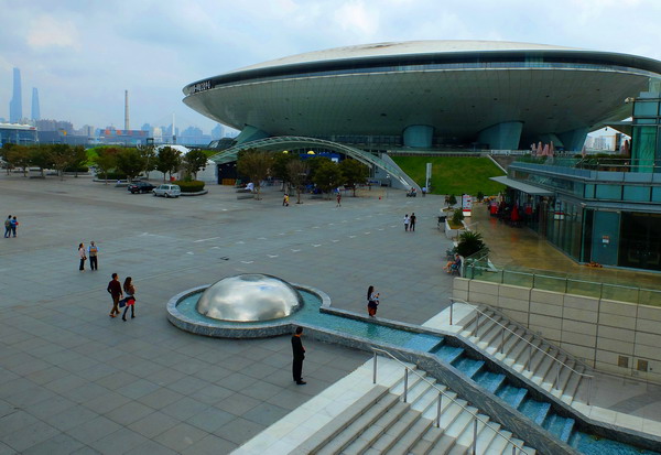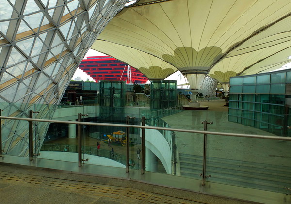 那“一轴四馆”的布局很像中文的“申”字。中间那一竖就是纵贯南北的‘“世博轴”,其实原来是个南北高架桥,现在改建成地上、地下各两层的长条形建筑,南北总长约1000米,东西宽约100米。包括顶层露天平台,共有5层(局部6层)空间,主要内容是购物、休闲、娱乐和餐饮。坐地铁8号线到“中华艺术宫”站下,从北出口出来就到到了“申”字的正中心地点。其东南方为中国馆,现在叫“中华艺术宫”,免费展出各类艺术作品,不断更新。东北角是飞碟形状的“文化中心”,里面有大小剧场影院,和餐饮、购物、地下溜冰场等。飞碟四周是360度观光走廊,可看黄浦江及大桥等周边美景。西北角是“世博中心”,其实是办公大楼,除了举办会议外,一般不开放。西南角是“主题馆”,就是一个四方的大展厅,举办各种展览,不断更新。我们去时正展出房车及珠宝,免费参观,漂亮的车模吸引了许多游客照相。