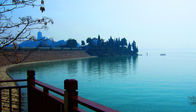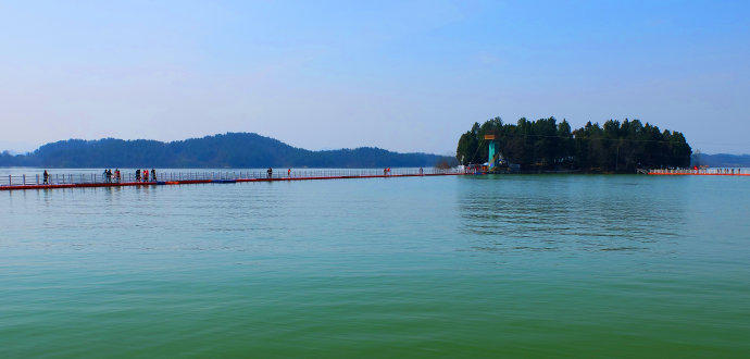 为了疏导游客,避免拥挤堵塞,游船出发和返程分别在西东两个码头。我们前面游的陆地公园只是其西半部分,顺着大坝向西到西部的出发码头。上到坝顶一看豁然开朗,只见碧波万顷,心旷神怡,和浙江的千岛湖感觉无异,与苏杭的金鸡湖及西湖相比,有大巫见小巫之感。游船有双层大船、单层小船,还有小快艇,全是电动无污染和噪音,不断来回运送游客,按照前面说的顺序,依次到五个岛游玩。每个岛上的景点内容都不一样,如燕子岛上有书画院和百鸟园,有美女表演孔雀舞,有真的孔雀开屏等。周瑜岛上有《三国演义》中东吴名将周瑜当年读书的地方,有高空过水溜索滑车等。风情岛上有美食小吃街、民俗风情展览等,景色绮丽。周围大小岛屿星罗棋布,有的用浮桥联通,有的靠游船摆渡。最后从东面的“松渡”码头上岸结束游岛。这里有两条道路可选:西边上去是二次进入陆地公园,游玩其东半部分,有著名的龙河塔等景点,登塔顶可遥望万佛湖全景;东面上去就直接出去结束游程。出口外面有美食街、住宿和购物等。