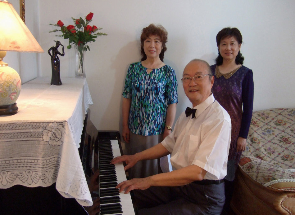 张老师原来感冒发声都困难。但她说一听到钢琴声就来神了,全身是劲,说我的钢琴弹得比她声学老师还好。我得到鼓励也来劲了,我们四个人关起门来练唱和录制了好几遍,最后挑一遍最好的上传到优酷网站了。请点击http://v.youku.com/v_show/id_XMzY0MTkyODk0NA==.html?spm=a2h3j.8428770.3416059.1 ,可以自动播放免下载。但因为网速问题,有时会出现音像不同步甚至无声。需要原文件的朋友可找我用QQ传送,有360MB,下载较慢,但播放质量好。